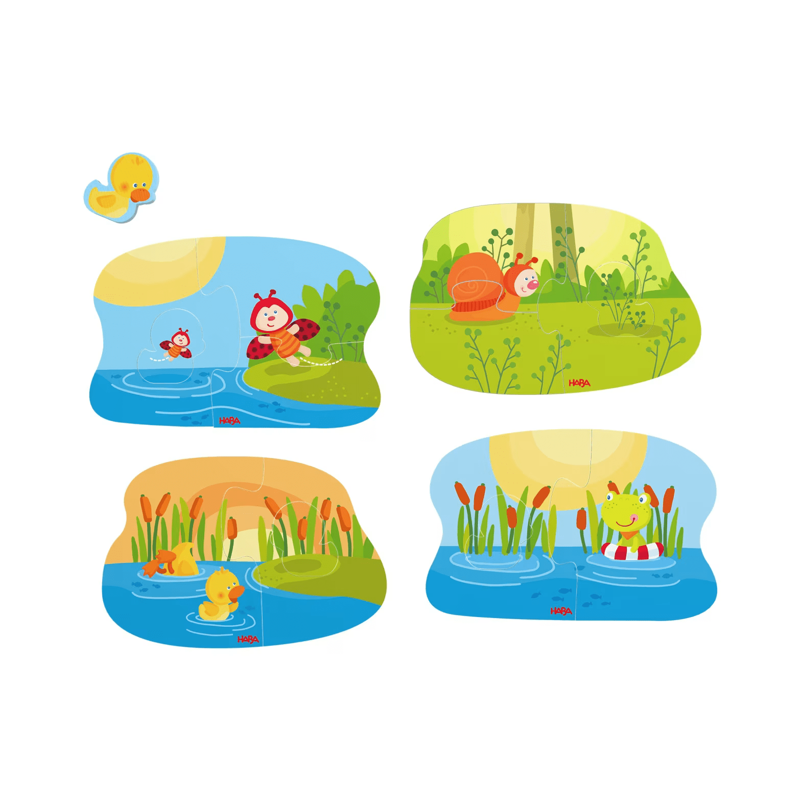 Mit den 4 ersten Puzzles – Tierkinder von HABA entdecken Kinder ab 2 Jahren spielerisch die Welt der kleinen Tiere. Ob Ente am Teich, hüpfender Frosch oder fröhlicher Marienkäfer – jedes Motiv lädt zum Staunen und Lernen ein. Das Set enthält große, stabile Puzzleteile, die leicht zu greifen sind, sowie eine beidseitig bedruckte Holzfigur, die sich perfekt in jede Szene einfügt und zum freien Spielen anregt.