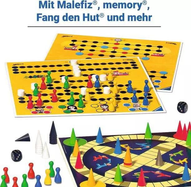 • Enthält bekannte Spiele wie memory®, Malefiz®, Fang den Hut®, Mühle, Dame, Halma