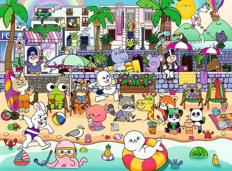 Dieses Kinderpuzzle zeigt eine farbenfrohe Strandpromenade voller Details. Auf dem Motiv sind zahlreiche Tiere zu sehen, die den Strand beleben: spielende Figuren im Sand, bunte Sonnenschirme, Palmen, Gebäude im Hintergrund und das Meer im Vordergrund. Die Szene ist ruhig, freundlich und klar strukturiert, sodass Kinder viele einzelne Bildbereiche entdecken können.