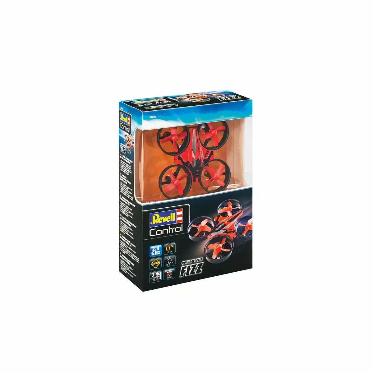Der Revell RC Quadrocopter Fizz gehört zu den kleinen ferngesteuerten Fluggeräten der Revell-Control Reihe. Der Copter startet nach kurzer Ladezeit und lässt sich präzise über die Handsteuerung lenken. Rotorschutzringe stabilisieren den Flug und schützen Propeller bei Kontakt mit Hindernissen. Kompakte Abmessungen machen Indoor-Flüge im Kinderzimmer oder Wohnzimmer möglich. Eine integrierte LED-Beleuchtung erleichtert die Orientierung während des Flugs.