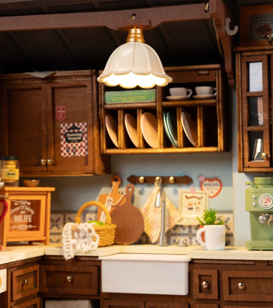 Der ROKR Baking Kitchen DG172 Holzbausatz ist eine liebevoll gestaltete Miniatur-Backküche mit nostalgischem Charme. Von der Fliesenwand im Retro-Look über das Antik-Spülbecken bis hin zum Backofen mit beweglicher Tür– jedes Detail wurde sorgfältig umgesetzt. In offenen Regalen finden sich Tassen, Teller, Honigtopf und Kekspackung. Mit den 359 präzise lasergeschnittenen Holzteilen bauen Sie in etwa sechs Stunden eine detailreiche Szene, die Wärme und Gemütlichkeit ausstrahlt. Alle Bauteile sind farblich vorbereitet, und dank der Snapfit- und Klebestreifen-Technikgelingt der Aufbau ohne Kleber oder Farbe. Ein Highlight für Liebhaber von Miniaturhäusern und Vintage-Dekor.