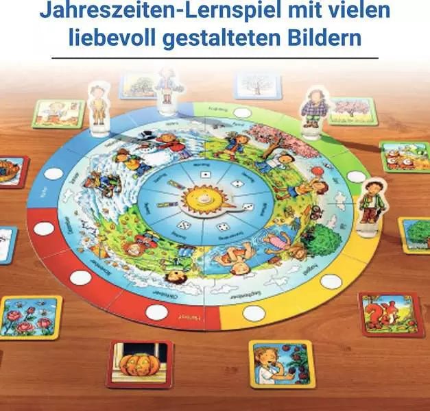 Anstelle eines Würfels drehen die Spieler eine lächelnde Sonne, die bestimmt, auf welches Feld sie gelangen. Dort ziehen sie Bildkarten und prüfen selbstständig anhand der Farbrahmen auf der Rückseite, ob ihre Zuordnung richtig ist. Zusätzlich sorgt ein Schnappspiel für Tempo und Abwechslung. Das Spiel vermittelt ein erstes Zeit- und Jahreszeitenverständnis und fördert eigenständiges Lernen durch Selbstkontrolle.