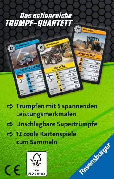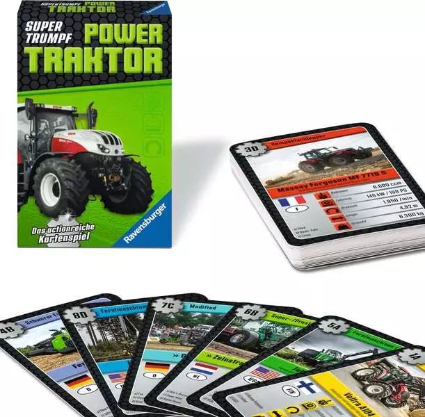 Mit Supertrumpf Power Traktor von Ravensburger erleben Kinder und Technikbegeisterte spannenden Karten- und Sammelspaß. Jede Karte zeigt einen leistungsstarken Traktor mit beeindruckenden technischen Werten. Ziel ist es, mit den besten Zahlen die Karten der Mitspieler zu übertrumpfen und am Ende alle Karten zu gewinnen.