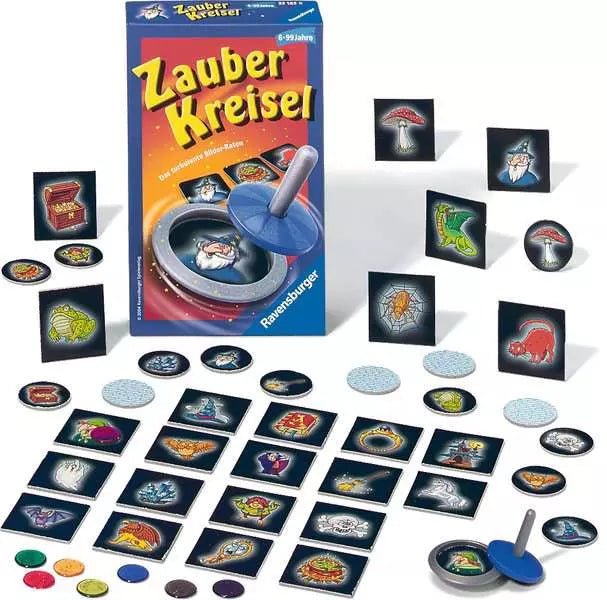 Beim Reisespiel Zauberkreisel ist volle Aufmerksamkeit gefragt. Ein Motiv wie Hexe, Kröte oder Kobold wird verdeckt in den Kreisel eingelegt. Sobald sich der Kreisel dreht, versuchen alle Spieler gleichzeitig zu erkennen, welches Motiv sich im Inneren befindet. Wer am schnellsten richtig reagiert, gewinnt den Kreiselchip.